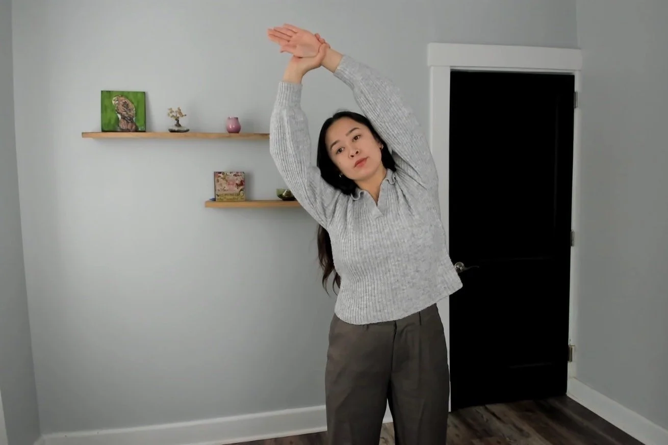 Reach arms overhead, right hand holding left wrist